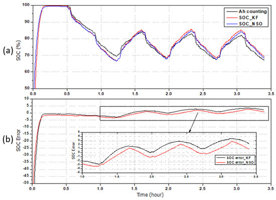 Figure 3d shows the estimated SOCs with the NSO and the LSO, and their errors with respect to the SOC calculated by the Coulomb-counting method. The battery was fully charged by constant current/constant voltage (CC-CV); thus, it was at 100% SOC prior to the test. Since the initial SOC was known, and the test occurred in a short period of time, the Coulomb-counting method could be used as a reference by neglecting error accumulation. In the experiments, 50% of the SOC was given as an initial value to verify the convergence of the proposed algorithm. As shown in Figure 3e, the estimated SOC tracked the true SOC value within 30 min, keeping the estimation error of the NSO less than 3%, while the estimation error of the LSO exceeded 4%. The SOC estimation results using the NSO were better than those using the LSO.