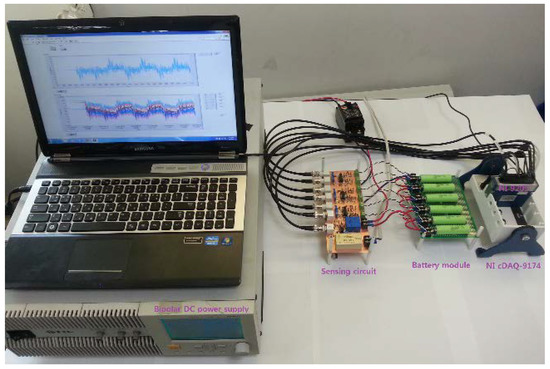 The C-rate is a measure of the rate at which a battery is charged or discharged relative to its nominal capacity. A dynamic charge/discharge current profile, as shown in Figure 3a, was applied to the battery. A 1/20 scaled-down battery current profile was required for the electric vehicle to complete eight cycles of the Urban Dynamometer Driving Schedule (UDDS), started after a 30-min relaxation time at the beginning of the test. It can be seen in Figure 3 that each UDDS cycle lasted for 22 min, and the SOC increased or decreased by 15% at each cycle. Therefore, the direction of current in UDDS cycles numbers 3, 5, and 7 was reversed. The actual SOCs of the cells were in between 20% and 85% SOC; thus, no cell was fully discharged. The current profile was specially designed in accordance with the actual working environment of EV applications. Moreover, it exhibited dynamic characteristics with stiff changes in magnitude of the current, and operated in between high and medium SOC, which is a common operating range of SOCs in EV applications. At first, the current profile was applied to a single cell. The cell was connected to a bipolar power supply (NF BP4610). A program created in Labview 11.0 automatically controlled the output of the bipolar DC supply, and recorded the voltage and current of the battery every second through an NI PCI-9205 and a sensing circuit, which had one current sensor and six voltage sensors. The ambient temperature during the test was 25 °C.