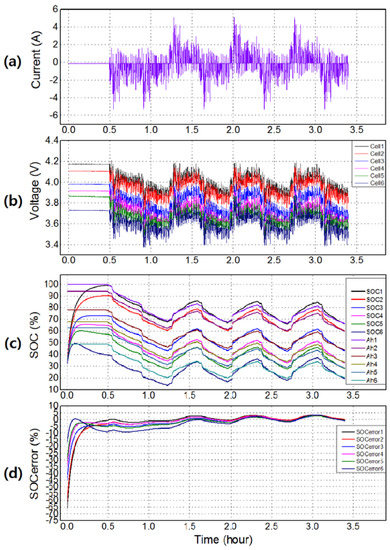 The experimental setup for the battery module test is shown in Figure 5. The current profile is shown in Figure 6a, and the voltage response of each cell in the battery module is shown in Figure 6b. Figure 6c shows the estimated SOC values of individual cells in the module using the proposed method, and using the Coulomb-counting method during the test.