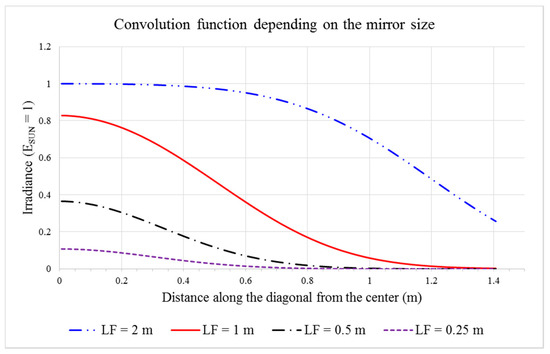 12], where Elsayed et al. presented experimental results (for a laboratory set-up); in the conclusion, they noticed that the range over which the irradiance is constant is reduced when the mirror is moved further away from the receiver or the mirror size decreases (point 4, page 409). In the present work, the same conclusion derives from a confrontation of