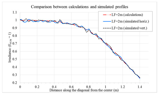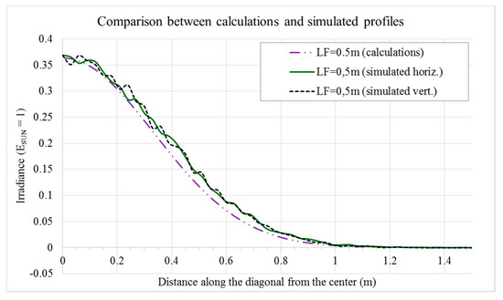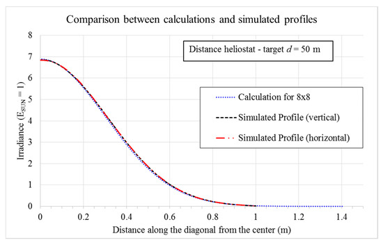 Figure 11 reports the comparison between the calculated profile and the two profiles of the simulated irradiance map. The calculated profile is diagonal on the target and the two simulated profiles (horizontal and vertical on the target) are diagonals with respect to the heliostat.