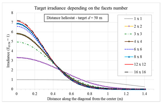 LF = 2 m), but the facets number changes from 1 to 256. It is supposed that all the facets lay of a spherical envelope and are oriented in order to reflect its central ray toward the center of the receiver (the little angle difference is neglected). The irradiance along the target diagonal is plotted in