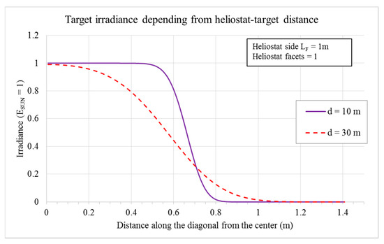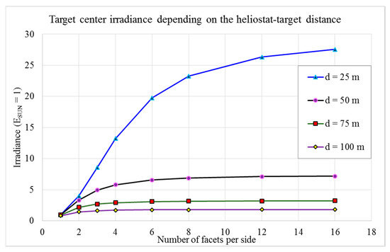 x = 0, depending on the values of the heliostat-target distance. In order to see how convenient could be to compose the heliostat surface with numerous facets, the irradiance is plotted versus the number of facets per side.