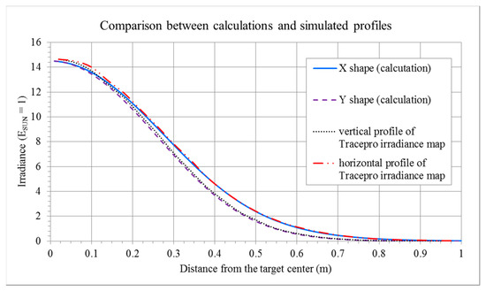 Some simulations were performed by means of TracePro (TracePro 2018 Expert Release 18.2, Lambda Research Corporation, Littleton, MA, USA), a software dedicated to lighting simulation. In the following text, “calculated results” or “calculated profiles” refer to the values obtained by the numerical integration of Equation (4), “simulated results” or “simulated shape” refer to the values obtained by TracePro raytracing. The irradiance maps and profiles are presented in
