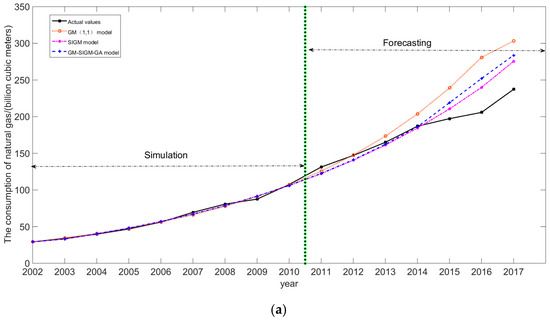From Table 6, it is clear to see that the proposed GM-S-SIGM-GA model receives the highest forecasting accuracy then other compared models, such as GM(1,1) [42], SIGM [1the DGM (1,1) [43], and EDGM [44] models. Firstly, the GM-SIGM-GA model is not always superior to GM(1,1) and SIGM, even when it has employed GA to intelligently determine the most suitable combined weight coefficients. However, the changes of the relevant operational mechanism from the reviewed/renewed energy policy are hardly learned or captured by the GA due to too small a data size in China’s current natural gas market. Therefore, the GM-SIGM-GA model could guarantee, with some difficulty, the superior forecasting performances.