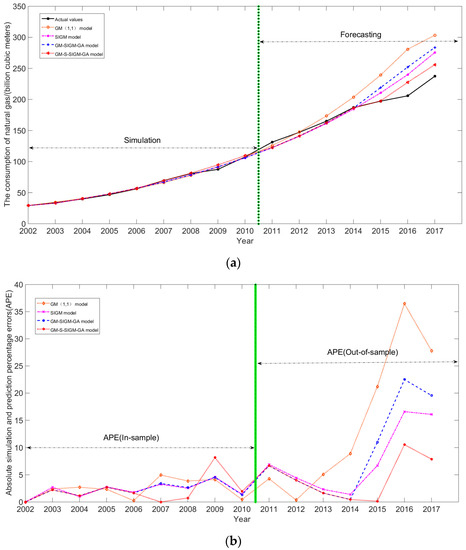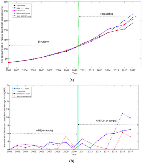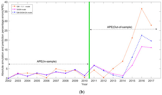 (a) The simulation and forecasting results of DGM(1,1), SIGM, GM-SIGM-GA, and GM-S-SIGM-GA models. (b) The forecasting errors (APE) of DGM(1,1), EDGM, GM-SIGM-GA, and GM-S-SIGM-GA models.