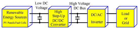 Nowadays, demand for clean or renewable energy sources has dramatically increased with population growth and the depletion of fossil fuel. Much effort has been made to explore renewable energy sources, such as photovoltaic (PV), fuel cell and wind energy systems [1,2,3]. The renewable energy grid-connected system with PV and fuel cells calls for high voltage-gain and high-efficiency dc-dc converters because the low voltage generated by the PV and fuel cells needs to be raised to a high voltage for the input of grid-connected inverter as shown in Figure 1. If the energy needs to be converted to a single-phase 220 V ac voltage utility grid, a 380–400 V dc bus voltage is required for the inverter. However, the outputs of PV and fuel cells are generally lower than 40 V [4] due to safety and reliability considerations in home applications. Thus, a front-end DC-DC converter with about ten times voltage gain is necessary to satisfy the requirement.