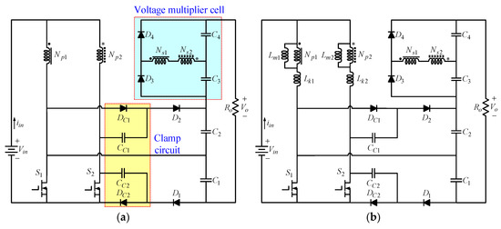 The proposed converter circuit is shown in Figure 2a, where and are the power switches, and are the clamp diodes, and are the clamp capacitors, and are the output diodes, and are the output capacitors, and are the switched diodes, and are the switched capacitors, and is the load. There are two coupled inductors in the proposed converter. The coupling references are marked by “” and “”. The circuit model of each coupled inductor includes an ideal transformer with the original turns ratio, which is in parallel with a magnetizing inductance and then in series with a leakage inductance. The equivalent circuit of the proposed converter is shown in Figure 2b, where and are the magnetizing inductance, and are the inductance, and are the primary and secondary windings of the coupled inductors, respectively, and the turns ratio of the coupled inductor is defined as . The dual passive clamp circuits are used to recycle the leakage energy and suppress the turn off voltage spikes on the power switches. The voltage multiplier cell is realized by the secondary windings of the coupled inductors with series connection, the switched diodes and the switched capacitors to increase the voltage gain.