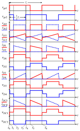 In the operational analysis, the proposed converter operates in continuous conduction mode (CCM), and the gate signals of the power switches are interleaved with the same duty ratio greater than 0.5 and a phase shift. The key waveforms are shown in Figure 3. There are six operating modes in one switching period. The equivalent circuits for each mode are shown in Figure 4.
