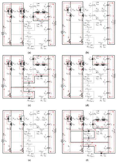 Operating modes of the proposed converter. (a) Mode 1; (b) Mode 2; (c) Mode 3; (d) Mode 4; (e) Mode 5; (f) Mode 6.