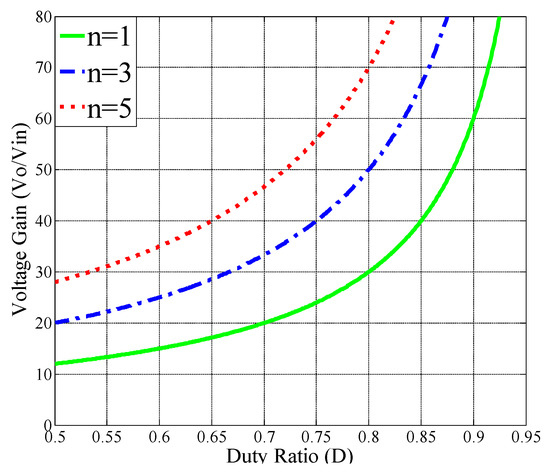 Equation (7) confirms that the proposed converter has a high step-up voltage gain without adopting an extremely large duty ratio. The curve of the voltage gain related to the turns ratio of the coupled inductor and duty ratio is shown in Figure 5. As the turns ratio of the coupled inductors increases, the voltage gain is extended significantly. When the duty ratio is only 0.6, the voltage gain reaches 15 with the turns ratio .
