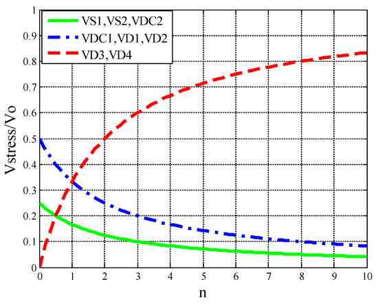 From the operating modes of the proposed converter, the voltage stresses of the output diodes and are equal to the voltages and , respectively. The voltage stresses of the switched diodes and are the voltage plus the voltage . The voltage stresses of the output and switched diodes can be expressed as