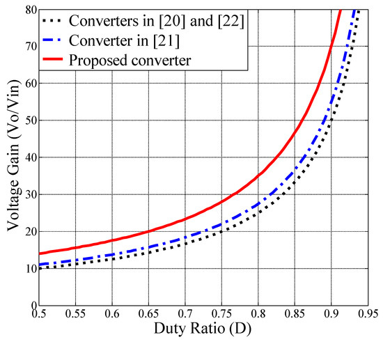 The performance comparison between the converters published in [20,21,22] and the proposed converter is shown in Table 1. The relationship between the voltage gain and the duty ratio in these converters with the turns ratio n = 1.5 is shown in Figure 7. It can be seen that the voltage gain of the proposed converter is higher than the other converters. In fact, if the turns ratio n of the coupled inductor is designed by less than 3, then the voltage gain of the proposed converter is the highest. Moreover, the voltage stress on the switches and the highest voltage stress on diodes of the proposed converter are the lowest among the compared converters. The component number of the proposed converter is less than that of the converter published in [21]. Clearly, the proposed converter is suitable for the high step-up and high voltage applications.
