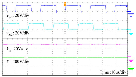 To validate the performance and effectiveness of the proposed converter, a 1000 W laboratory prototype with 28-V input and 380-V output voltages was built and tested with the specifications and parameters shown in Table 2. The experimental results shown in the Figure 8, Figure 9, Figure 10, Figure 11, Figure 12, Figure 13, Figure 14 and Figure 15 are measured under full-load conditions 1000 W.