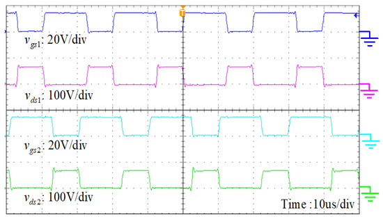 Figure 8 shows t waveforms of the interleaved PWM signals and , the input voltage = 28 V and the output voltage = 380 V. The duty ratio is about 0.58. Thus, the high step-up voltage gain is realized without operating at an extremely large duty ratio. The waveforms of gate signals and the drain-source voltages and are shown in Figure 9. It can be seen that the voltage stresses on the power switches are about 63 V, which is only one-sixth of the output voltage. Thus, one can adopt low-voltage-rated devices to reduce the conduction and switching losses.