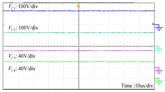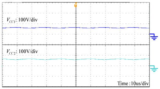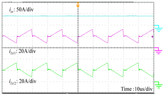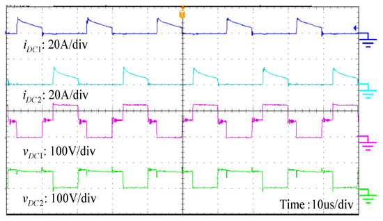 Figure 10 depicts the waveform of the voltages on the output capacitors and the switched capacitors. Because the turns ratio n is equal to one, the voltages and are half of and . The experimental results are in a good agreement with the theoretical analysis given in Equations (2)–(5). Figure 11 shows the voltages on the clamp capacitors. It can be seen that the voltage ripple is small, which can clamp the voltage stress of the power switches. Figure 12 shows the waveforms of the input current and the currents through the leakage inductances. As can be seen, the currents through the leakage inductances are interleaved such that the input current ripple is very small. The average current of is quite similar to , which is a half of the input current. Thus, the current sharing performance is good due to the symmetrical interleaved structure.
