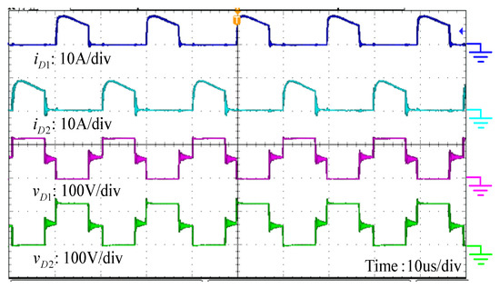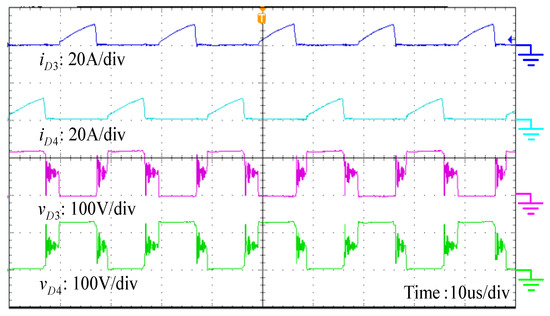Figure 13, Figure 14 and Figure 15 depict the voltage and current waveforms on the clamp diodes, output diodes and switched diodes, respectively. One can see that the reverse recovery currents are very small because the current falling rates are controlled by the leakage inductances. As a result, the reverse recovery losses are alleviated. The voltage stress on the clamp diode is half of that on clamp diode , which is consistent with the theoretical analysis in Equations (11) and (12). The voltage stress on output diodes and switched diodes – are almost identical to the turns ratio n of one, which is in agreement well with the theoretical analysis in Equations (9) and (10). The overvoltage and ringing on the diodes and are larger than to the other diodes, as shown in Figure 15. This is a result of the simplified equivalent circuit with the leakage inductance introduced only on the primary side such that the clamp circuits are ineffective, to limit the overvoltage on and . Furthermore, the voltage stresses of all the diodes are much lower than the output voltage.