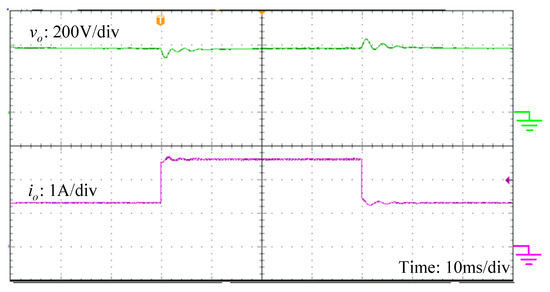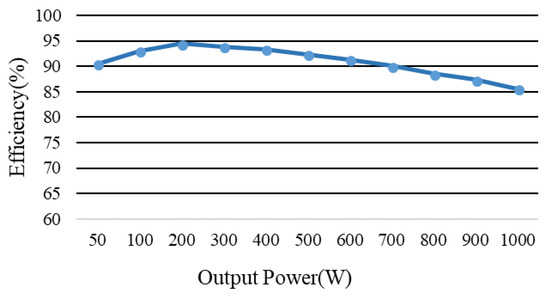 In order to obtain a regulated and constant output voltage in spite of input voltage variation and output load disturbance, the closed-loop control with type III compensator is implemented [23]. There are three poles (one at the origin) and two zeros provided by this compensation. The experimental result under the step load change from half load 500 W to full load 1000 W and vice versa is illustrated in Figure 16. It can be seen that the transient voltage ripple of the output voltage is small and insensitive to the load change. This means that the compensator design can deliver a dynamic performance. The experimental conversion efficiency of the presented converter is given in Figure 17, which is measured by the power analyzer (HIOKI 3390). The full-load efficiency is about 86% and the peak value of efficiency is 94.5% obtained at the output power of 200 W.