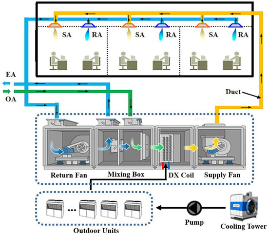 - Lee, K.H. A calculation method of the cooling performance for the direct expansion (DX) air handling unit (AHU)-water source VRF system. Soc. Air-Cond. Refrig. Eng. Korea 2016, 45, 64–68. [Google Scholar]