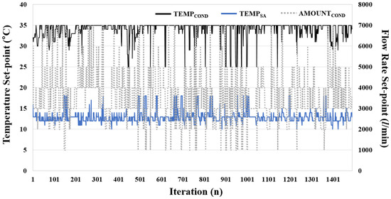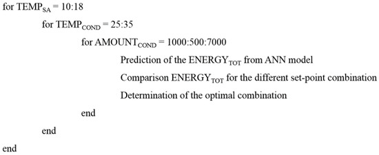 - The ANN-based predictive control algorithm determined the optimal set-points of the VRF system. For most of the cases, TEMPSA, TEMPCOND, and AMOUNTCOND were in the stable range of 12–14 °C, 35 °C, and 3000–5000 L/min, respectively