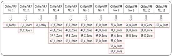 - Chung, M.H.; Yang, Y.K.; Lee, K.H.; Lee, J.H.; Moon, J.W. Application of artificial neural networks for determining energy-efficient operating set-points of the VRF cooling system. Build. Environ. 2017, 125, 77–87. [Google Scholar] [CrossRef]