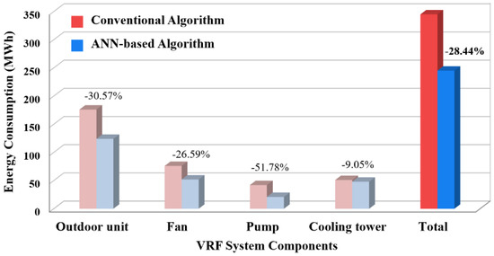 - The algorithm also markedly saved the cooling energy consumption of the VRF cooling system during the 62 days from the 1 July to the 31 August. The total cooling energy saved was 28.44%, which corresponds to an electrical energy reduction of approximately 95,509 kWh or 13,562,278 Korean won (12,054 U.S. dollars).