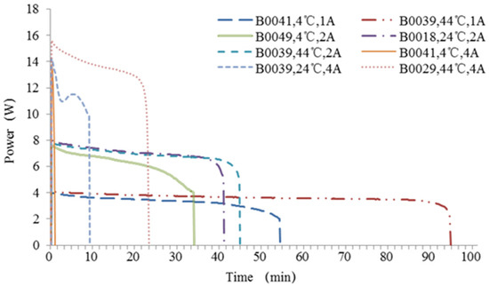 The battery discharging characteristics at different temperatures and currents are plotted in Figure 1. It can be seen that the batteries discharging at 4 A will achieve a higher power output than those at 2 A and 1 A. However, all the power outputs of batteries dropped quickly within 30 min, and the one at 44 °C can last the longest time. All the batteries discharging at 2 A and 1 A have a steady discharging period. The higher power output the battery has, the less batteries are needed in the battery pack. In a day-ahead power dispatch, the dispatch time scale is set at 15 min, and thus the operational time of the SLB pack needs to be at least 15 min. The SLB pack only meets this requirement at the discharging current of 1 A and 2 A. Thus, the rated current (i.e., 2 A) is chosen in this case. According to Figure 1, the discharging time is the longest at the temperature of 44 °C. Therefore, the SLB operating temperature is set at 44 °C to achieve a long discharging time. Under a BMS balance control, the output power of battery cells is 8 W (at 2 A and 44 °C).