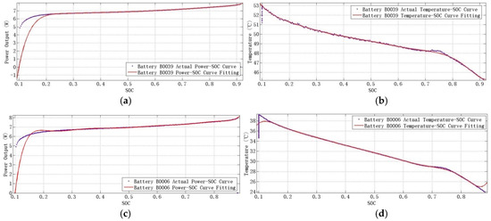 Battery actual characteristic curve fitting. (a) is Battery B0039 actual power-SOC curve fitting; (b) is Battery B0039 actual temperature-SOC curve fitting; (c) is Battery B0006 actual power-SOC curve fitting and (d) is Battery B0006 actual temperature-SOC curve fitting.