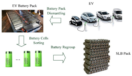 Battery cells are dismantled from electric vehicle (EV) and regrouped to a second life batteries (SLB) pack.