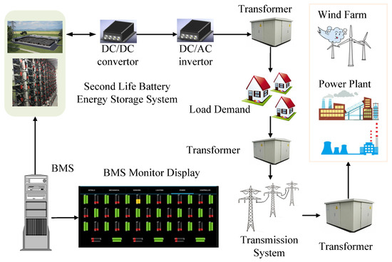 In the literature, however, there is no reported work on the utilization of SLBs in power dispatch as flexible loads at MW levels. In theory, SLBs can be connected to the supply side as a “power generator” or the load side as a “flexible load”, but the former has higher voltage quality and stability requirements than the latter. Furthermore, the lower voltage grade on the load side requires fewer batteries to be connected to the grid, so as to ensure the safety and stability of the battery packs [31,32]. The characteristics of SLBs have changed after their first life in the EVs and their performance datasheets from original manufacturers are no longer valid for analyzing their second life operation [28]. Thus, new functions for battery management system (BMS) [33,34] are needed to measure individual cells and manage the performance of the SLBs.