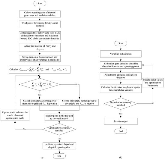 Flow charts. (a) is the flow chart of economic dispatch optimization and (b) is the flow chart of Interior point method.