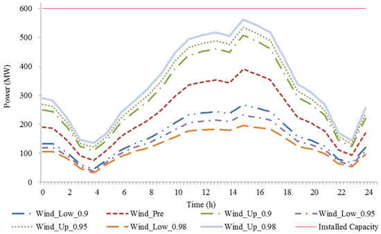 Predicted wind power and wind power bounds at different confidence degrees.