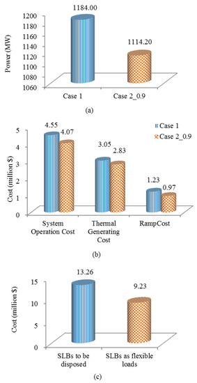 Similarly, Figure 14 also revealed that it is better to connect SLBs on the load side than the supply side, from the economic perspective. SLBFLs can reduce the peal-valley difference of load, which reduces the fluctuation of the supply. Thermal generators can then run more smoothly so as to lower their ramp costs and operation costs. In this work, the power dispatch decisions in Case (3) are based on the optimization process, whilst the ramp cost of individual generator can be increased or decreased. This again confirms that the SLBs are better to be placed on the load side of the system.
