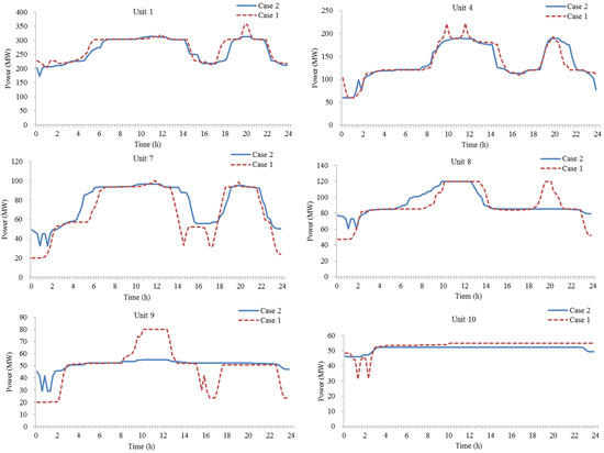 Active power generating curves of Unit 1, Unit 4 and Units 7–10 in Case 1 and Case 2 with 0.9 confidence degree.