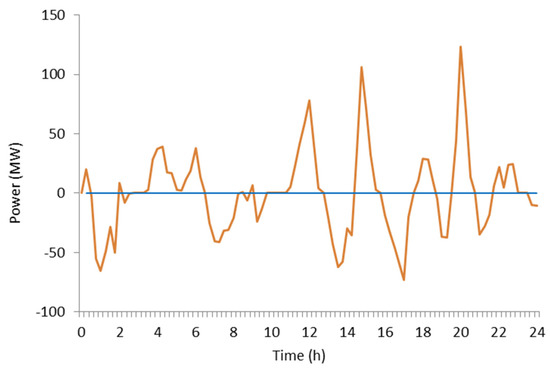 where and are the total power generation and the total load demand at time t, respectively. is the total generator power output during the tth time period. is the predicted wind power of wind farm i at time t. is the total predicted wind power output at time t. is the SLB power output at time t. If it is positive, the SLBs is charged by the power grid. If negative, the SLBs are discharging power to the grid. is the total load demand during the tth time period: