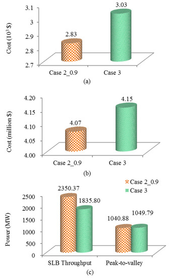 Results comparison of Case 3 and Case 2 with 0.9 confidence degree. (a) is the thermal generating cost comparison; (b) is the system operation cost comparison and (c) is the SLB throughput and peak-to-valley comparison.