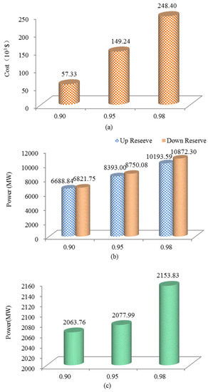 Case 2 is the power dispatch with wind farms and SLBFLs while the wind power reserve confidence degree is set at 0.9, 0.95 and 0.98. It can be seen from Figure 15a,b, the system reserve cost, the up-reserve and down-reserve values at confidence degree 0.9 are the lowest, followed by those at 0.95 and 0.98 confidence degrees. The SLBFL throughput at different confidence degrees is shown in Figure 15c. It is clear that the SLBFL throughput increases with the wind power uncertainty.