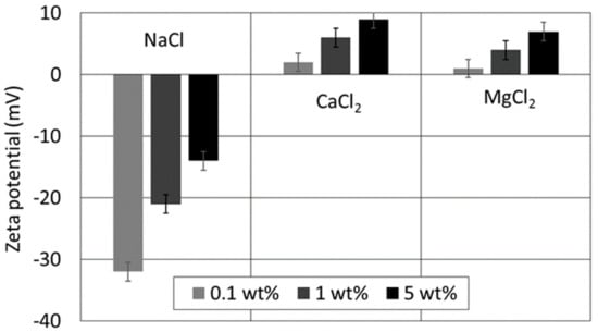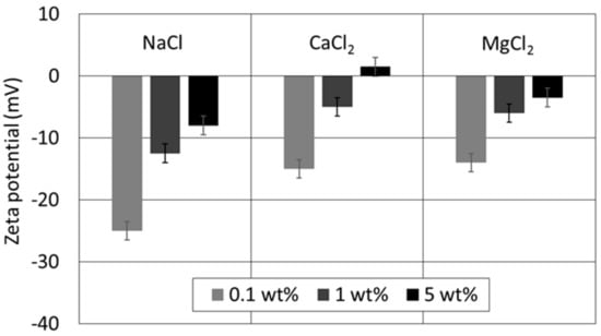 Ion type significantly affected zeta potential of oil/brine at a given concentration (Figure 1). Monovalent cations, Na+, gave a strongly negative zeta potential compared to divalent cations, e.g., Ca2+ and Mg2+. To be more specific, at the concentration of 1 wt %, equivalent to 10,000 mg/L, while all zeta potentials of oil/NaCl were negative, NaCl gave a stronger negative zeta potential (−12.5 mV) compared to CaCl2 (−5.2 mV) and MgCl2 (−6.1 mV). Similar trend was also observed by Nasralla et al. [27], who showed that NaCl yields a more negative zeta potential compared to CaCl2 and MgCl2 using two different crude oils. This is because divalent cations, e.g., Ca2+ and Mg2+, have a much stronger affinity towards oil surfaces due to a double charge number compared to Na+, thus compressing electrical double layer [28]. This also suggests that ion type may need to be manipulated to design the hydraulic fracturing fluids, thus wettability.