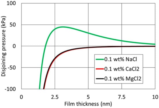 Divalent cations (Ca2+, Mg2+) gave rise to negative disjoining pressures (Figure 3) even in the presence of 0.1 wt % concentration, suggesting an oil-wet system. Rather, monovalent cations triggered positive disjoining pressures (Figure 3), implying a water-wet system at the same salt concentration. It is worth mentioning that negative disjoining pressures mean attractive forces, and positive disjoining pressures mean repulsive forces [14]. It is also worth noting that van der Waals interactions and structural forces are largely insensitive to electrolyte type, concentration and pH [29]. These forces were therefore considered as fixed in this study. Figure 3 illustrates that both MgCl2 and CaCl2 generated attractive forces between interfaces of oil/brine and brine/kaolinite at the concentration of 0.1 wt %. This is because divalent cations (e.g., Ca2+ and Mg2+) significantly compress the electrical double layer due to a higher charge density than monovalent cations (Na+) [30], thus lower double-layer expansion force, or even generating attractive electrical double layer force due to the opposite polarity of the zeta potential of oil/brine and brine/kaolinite [31]. For example, MgCl2 and CaCl2 with concentration of 0.1 wt % generated opposite polarity of zeta potential of oil/brine and brine/kaolinite (Figure 1 and Figure 2), thus yielding negative disjoining pressure profiles, showing a monotonically decrease with increasing in the separation distance. Overall, the divalent cation (Mg2+ and Ca2+) triggers negative disjoining pressures with a concentration of 0.1 wt %, suggesting that increasing divalent cations likely shifts wettability towards more oil-wet, thus avoiding capillary forces induced water uptake into shale oil reservoirs. Rather, removing divalent cations from the hydraulic fracturing fluids may increase the thickness of electrostatic double layer, thus increasing the capillary pressure and imbibition rate [9].