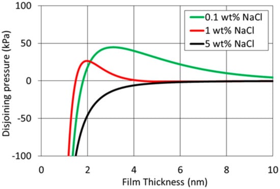 Increasing concentration shifted disjoining pressure from positive to negative (Figure 4), meaning altering system from water-wet to oil-wet. Given that the electrolytes concentration affects the Debye Length [32], which in return impacts the double layer expansion [31], we examined the effect of concentration of monovalent cation (NaCl) on disjoining pressure. Figure 4 shows that 0.1 and 1 wt % concentration of monovalent cation (Na+) resulted in positive disjoining pressures, but the disjoining pressure exhibited a progressively more repulsive barrier at increasingly close separation with decrease of NaCl concentration. Rather, the disjoining pressure profiles given by 5 wt % NaCl were negative, and monotonically decreased with increasing the separation distance although the interface of oil/brine and brine/rock were negatively charged (Figure 4). This is because van der Waals forces are strongly negative [33]. Therefore, to convert the disjoining pressure from negative to positive, strongly negative zeta potential at interface of oil/brine and brine/minerals are much needed. It is worth noting that divalent cations effect on disjoining pressure at various concentration were not documented in this section because 0.1 wt % CaCl2 and MgCl2 already rendered negative disjoining pressures (Figure 3). Similar trend was also reported by Xie et al. [34] who showed that increasing NaCl concentration solution shifts the disjoining pressure from positive to negative due to reduced electrostatic screening, suggesting an oil-wet system.