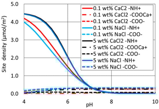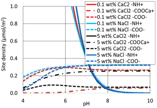 Apart from pH and brine type, ion concentration also affected the number of surface species at oil/brine interfaces. For example, at pH < 6.5, increasing salinity increased the number of -NH+, whereas a shift was observed at pH = 6.5. Moreover, increasing CaCl2 increased the number of –COOCa+ due to Reaction (3) shifting towards right-hand side (Figure 6). For example, at pH = 6, 0.1 wt % CaCl2 showed –COOCa+ of 0.012 µmol/m2. Rather, 5 wt % CaCl2 showed –COOCa+ of 0.23 µmol/m2. On the contrary, the number of –COO− decreased in the presence of 5 wt % CaCl2 compared to 0.1 wt % CaCl2. However, the concentration of NaCl did not affect the number of surface species of –COO− (Figure 6) due to the absence of Ca2+. the concentration of ions influence the activity of H+ regardless of the ion type [20]. We believe that the high salinity compensates the degree of deprotonation, thus triggering more –NH+ in the high salinity brine.