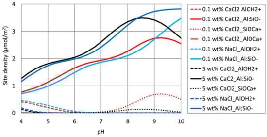 Site density (>AlO− + >SiO−) of brine/kaolinite increased with increasing pH in the presence of NaCl regardless of concentration due to Reactions (5) and (6) shifting towards right-hand side (Figure 7). Given that >AlO− and >SiO− are negatively charged, both were added together and termed site density of >Al:SiO- (Figure 7). For example, the number of >Al:SiO- increased from 0.7 to 3.5 µmol/m2 as pH increased from 4 to 10 in the presence of NaCl at concentration of 0.1 wt %. The same trend was observed in the presence of NaCl at concentration of 5 wt %, but with higher site density. We believe this is largely because increasing NaCl concentration increases the activity coefficient of >AlO− and >SiO−. Electrolyte, CaCl2, followed the same trend as NaCl, whereas the number of >Al:SiO− decreased as pH > 8.5 for 5 wt % CaCl2, and pH > 9.2 for 0.1 wt % CaCl2 (Figure 7). This shift stems from Reactions (7) and (8), showing that further increasing pH generates more >AlOCa+ and >SiOCa+ in line with Figure 7. It is worth noting that 0.1 wt % CaCl2 yielded a greater number of >SiOCa+ that 5 wt % CaCl2. We also believe increasing Ca2+ increasing the activity coefficient of >AlO− and >SiO−, thus more >Al:SiO−, but less >SiOCa+. This implies that more bridges likely be generated between -COOCa+ and >Al:SiO− in the presence of high concentration of Ca2+, thus a more oil-wet system.