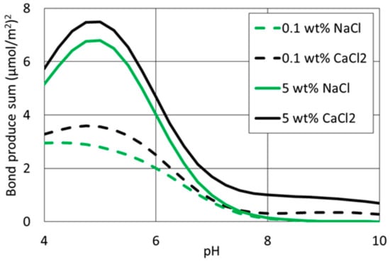 Increasing salinity increased bond product sum at a given pH (Figure 8), suggesting a more oil-wet system. For example, at pH = 6, 5 wt % NaCl gave a BPS of 4 (µmol/m2)2, but 0.1 wt% NaCl gave a BPS of 2 (µmol/m2)2. Similarly, at pH = 6, 5 wt % CaCl2 gave a BPS of 4.7 (µmol/m2)2, whereas 0.1 wt % CaCl2 gave a BPS of 2.5 (µmol/m2)2. Similar results were also reported by Brady et al. [20], who showed that high salinity NaCl gave a BPS of 0.3 (µmol/m2)2, but low salinity NaCl leads to a BPS of 0.15 µmol/m2 using an oil with AN/BN = 0.