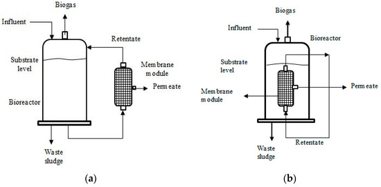 A schematic of AnMBR configurations—(a) Side or external membrane (b) submerged membrane.