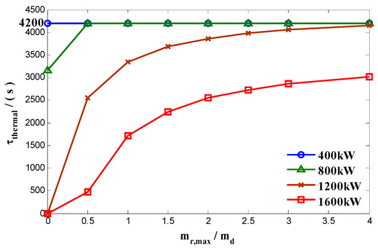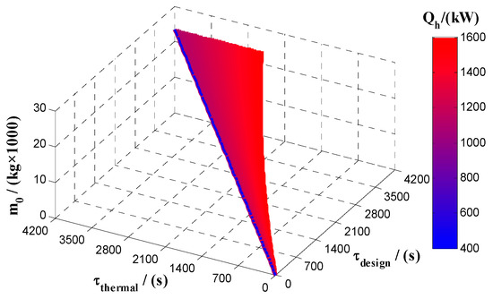 - For the case of = 1200 kW, if τdesign ≤ 2200 s, then τthermal = τdesign. If τdesign > 2200 s, then τthermal < τdesign. The increase of m0 helps to prolong τthermal. Although the cooling demand of thermal load can be satisfied after 2200 s, the maximum flight time is decided by τthermal. It is 3855 s when m0 = 23.52 × 103 kg;