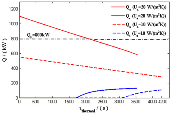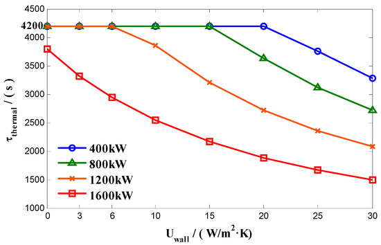- There is a critical Uwall for a certain . The condition, τthermal = 4200 s, can be satisfied when Uwall is smaller than 20 W/(m2K) for = 400 kW. So, the critical Uwall is 20 W/(m2K) for = 400 kW. In this way, the critical values of Uwall will be 15 W/(m2K) and 6 W/(m2K) for kW and kW, respectively. Howver, there is no critical Uwall for kW and its τdesign is always less than 4200 s;