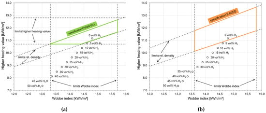 Impact of H2 on natural gas (Russia H) with different regulatory limits; after [5]; (a) specification limits according to Austrian regulations ÖVGW G31 [4]; (b) specification limits according to European regulations EASEE [6].