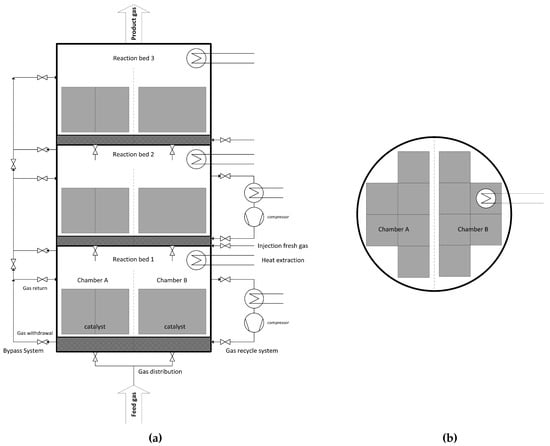 Simplified scheme of a multi bed reactor with three beds and two chambers [23]; (a) elevation; (b) floor plan.