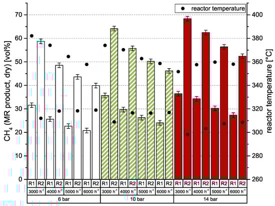 As known from previous investigations of catalytic methanation [26,27,28], there is a strong dependency of CO2 conversion on GHSV (gas hourly space velocity) and pressure level. For best results, high pressures and low space velocities are preferred. Of course, the number of reaction stages is also important. This behavior was also observed in the current experiments, which were conducted with an undiluted, stoichiometric mixture of H2:CO2 = 4.0. Results are shown in Figure 3. The left y-axis represents the dry CH4 content after a particular methanation reactor (MR). Additionally, the right y-axis shows the reactor temperature, which was measured directly below (gas entrance) the honeycomb catalyst. At 6 bar, the catalytic methanation achieves comparably poor results, but with a low space velocity of 3000 h−1 even 58.7 vol % CH4 is possible. It also can be seen that the CH4 content is nearly doubled in the second reactor stage. According to earlier experiments [26,27,28], conversion rates are decreasing with increasing space velocity. To improve conversion rate and consequently CH4 level of the product gas, the system pressure needs to be adjusted to higher values. The impact of 10 and 14 bar compared to 6 bar is also depicted in Figure 3. While 10 bar leads to an increase of approx. 5 vol % CH4, a system pressure of 14 bar allows for an improvement of ≥10 vol % CH4 after reactor 2 (R2). Due to the arrangement of the temperature sensors and the high heat losses of the vessel, the reactor temperature remains quite constant between 350 and 380 °C for R1 and 300–320 °C for R2.