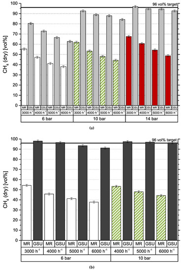 Figure 4 shows the results obtained by gas separation unit (GSU) in the combined process. The presented feed composition (MR) differs from results in Figure 3 (R2), which is caused by the experimental setup. Since both test plants are originally designed for stand-alone operation, they use separate gas analyzers. Furthermore, data cannot be collected simultaneously, due to the impact of gas sampling on downstream processes. Consequently, values are measured at different dates, process conditions deviate slightly and CH4 content is varying. Results for module 1 can be seen in Figure 4a. Most importantly, the targeted product gas quality of 96 vol % CH4—to comply with Austrian natural gas regulations—can be accomplished, but only for the lowest GHSV of 3000 h−1 and the highest pressure level of 14 bar. At 6 bar, CH4 concentration increases by around 25 vol % independent of GHSV. Elevated pressure levels show an improved increase in CH4 concentration from 30 vol % (GHSV = 3000 h−1) to 40 vol % (GHSV = 3000 h−1) at 10 bar and from 30 vol % (GHSV = 3000 h−1) to 45 vol % (GHSV = 3000 h−1) at 14 bar. Module 2, with results depicted in Figure 4b, shows a very different picture. For the same set of inlet concentrations from methanation, the targeted product specification is achieved at 6 bar at GHSVs 3000 h−1 and 4000 h−1 and for all experiments conducted at 10 bar. An experimental assesment of module 2 at 14 bar was not possible, due to the module’s high permeances compared to module 1. Figure 5 represents CH4 recovery (see Equation (4)) on the y-axis versus stage cut (see Equation (5)) on the x-axis. The semi-filled markers indicate experiments that fulfilled the target CH4 concentration: